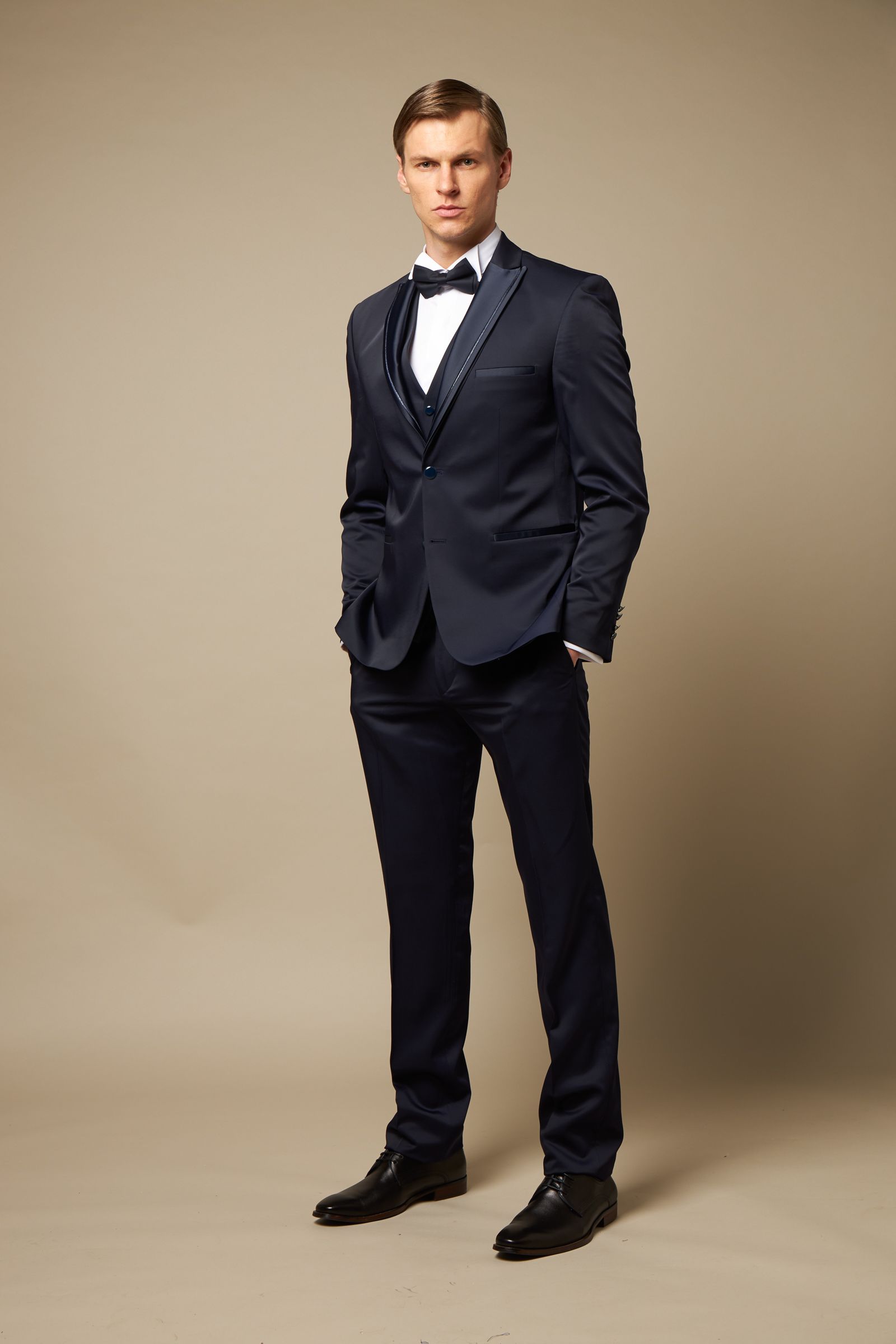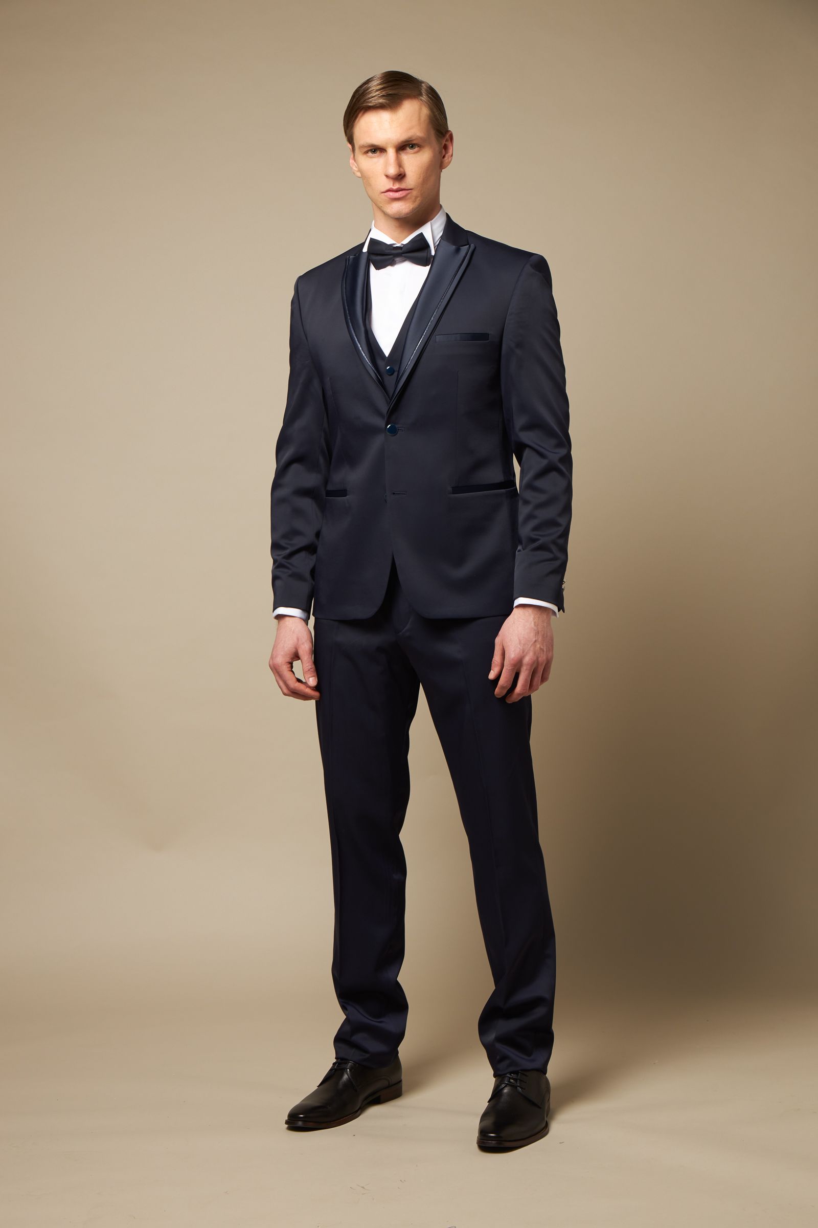 Γαμπριάτικο κουστούμι με γιλέκο και παπιγιόν ιδανικό για την πιο σημαντική σας στιγμή.Το σακκάκι είναι ραμμένο σε στενή γραμμή δύκουμπο με δύο ανοίγματα και όρθιο πέτο μύτη.Οι τσέπες φιλέτο και τα κουμπιά είναι ντυμένα από το ίδιο ύφασμα,το παντελόνι είναι χωρίς πιέτα σε στενή γραμμή.