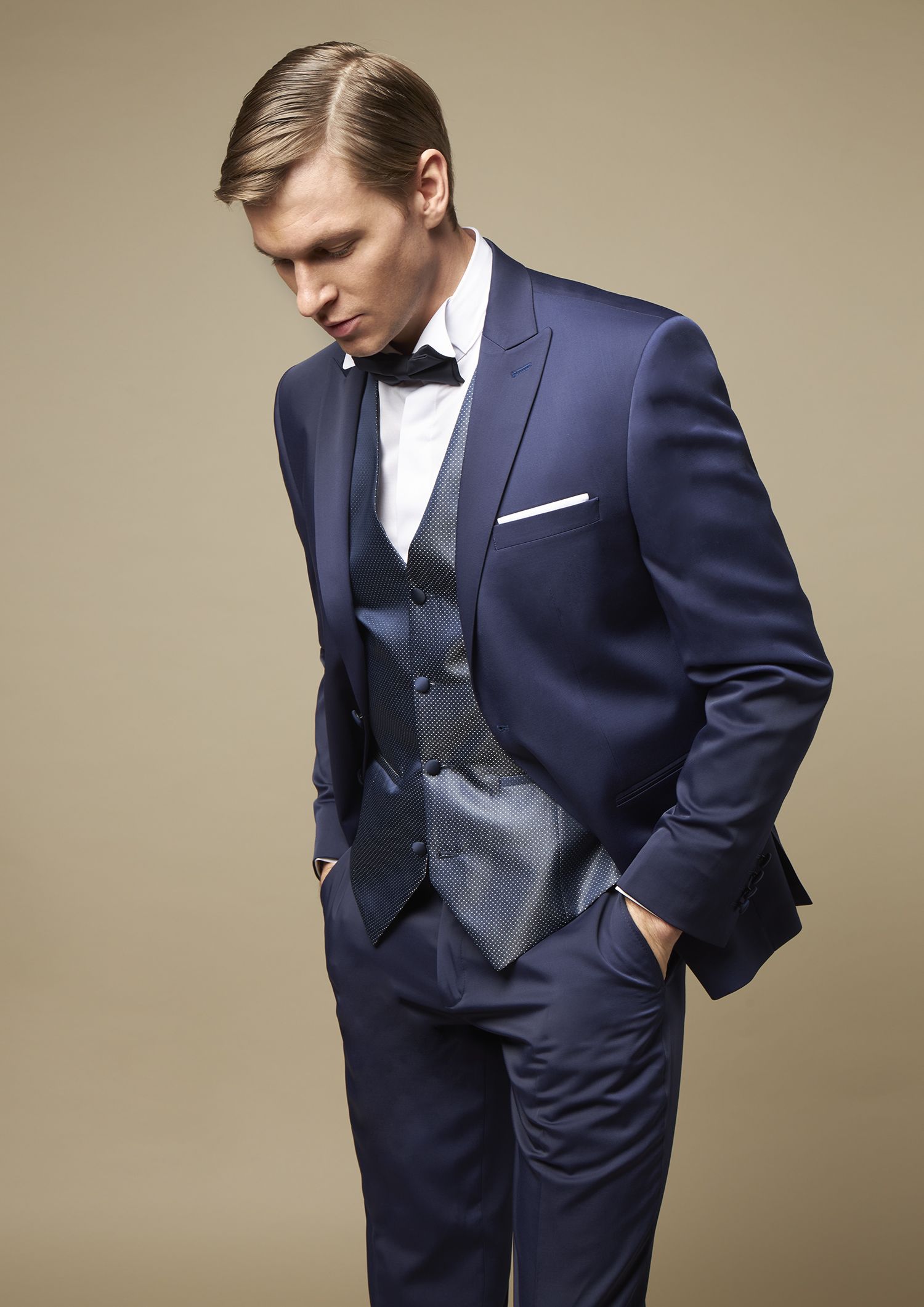 Γαμπριάτικο κουστούμι με γιλέκο και γραβατίνι ιδανικό για την πιο σημαντική σας στιγμή.Το σακκάκι είναι ραμμένο σε στενή γραμμή δύκουμπο με δύο ανοίγματα και όρθιο πέτο  μύτη.Οι τσέπες φιλέτο και τα κουμπιά είναι ντυμένα από το ίδιο ύφασμα,το παντελόνι είναι χωρίς πιέτα σε στενή γραμμή.