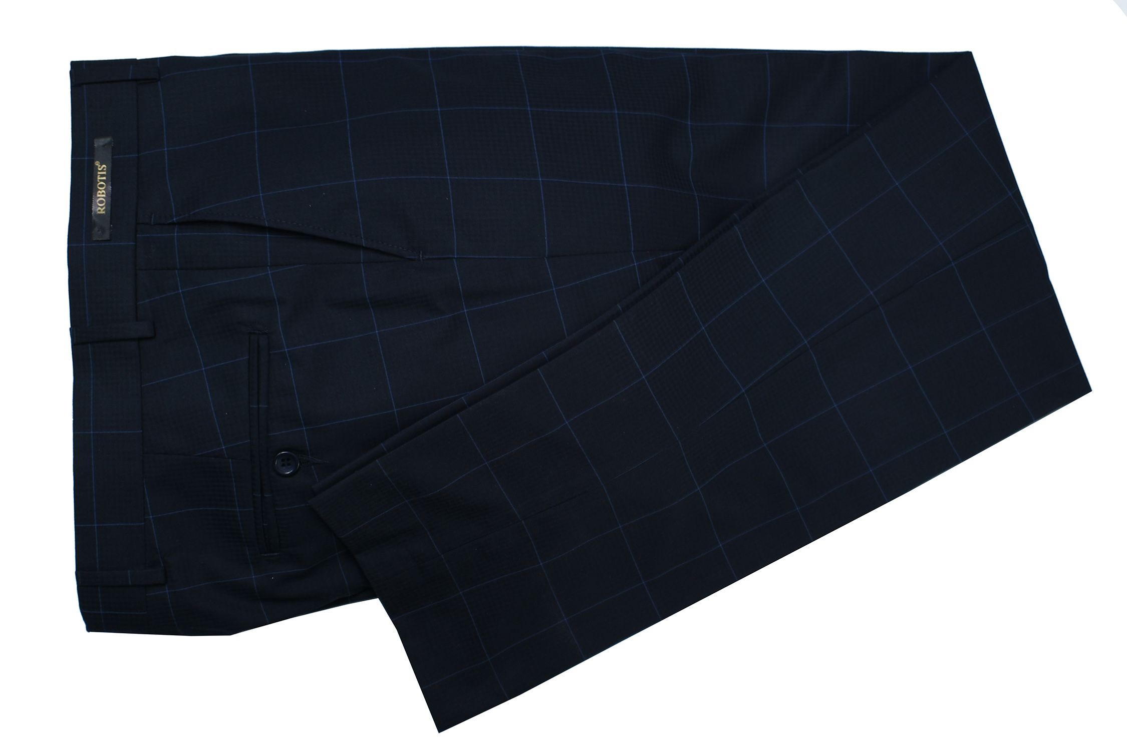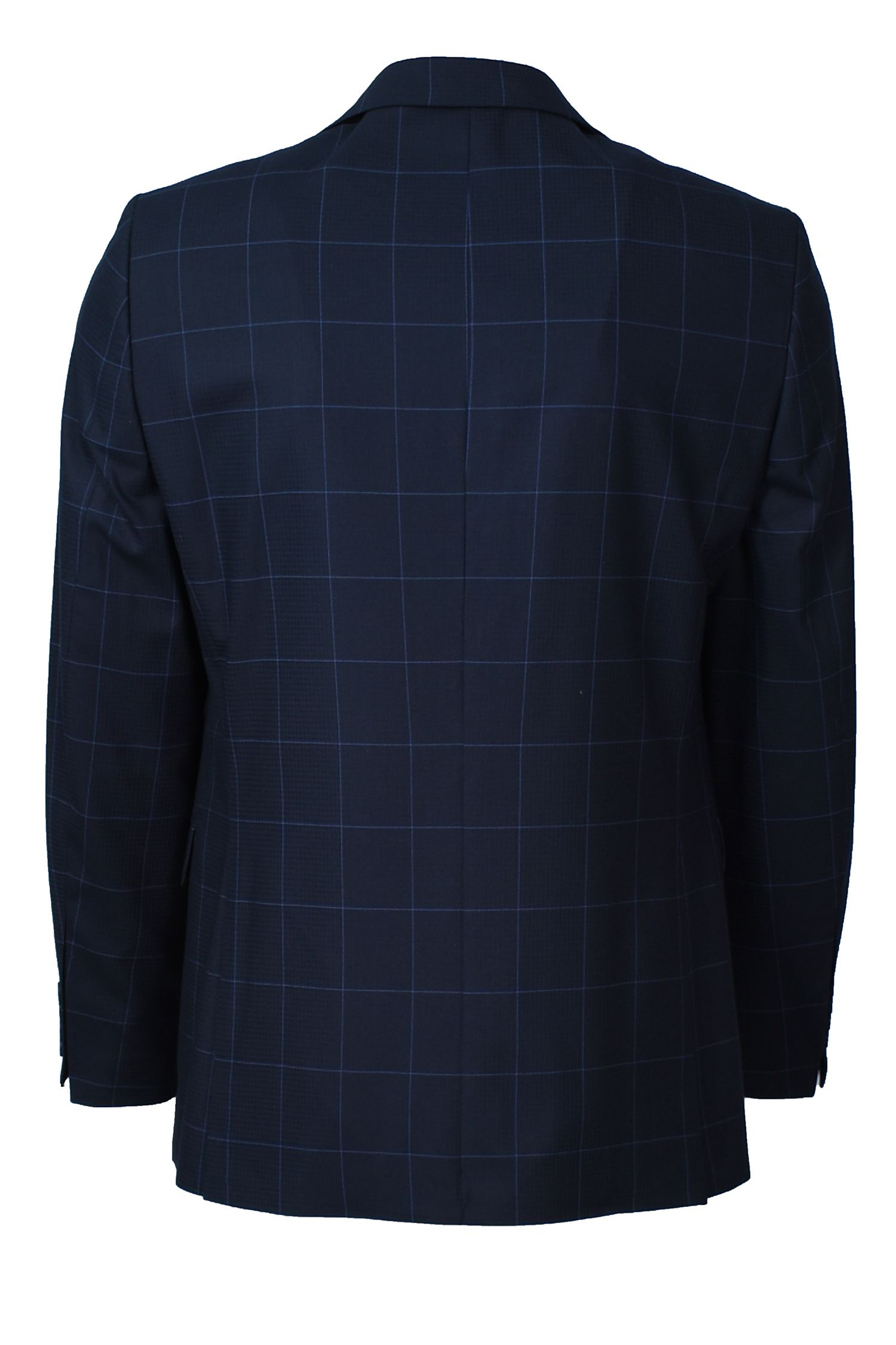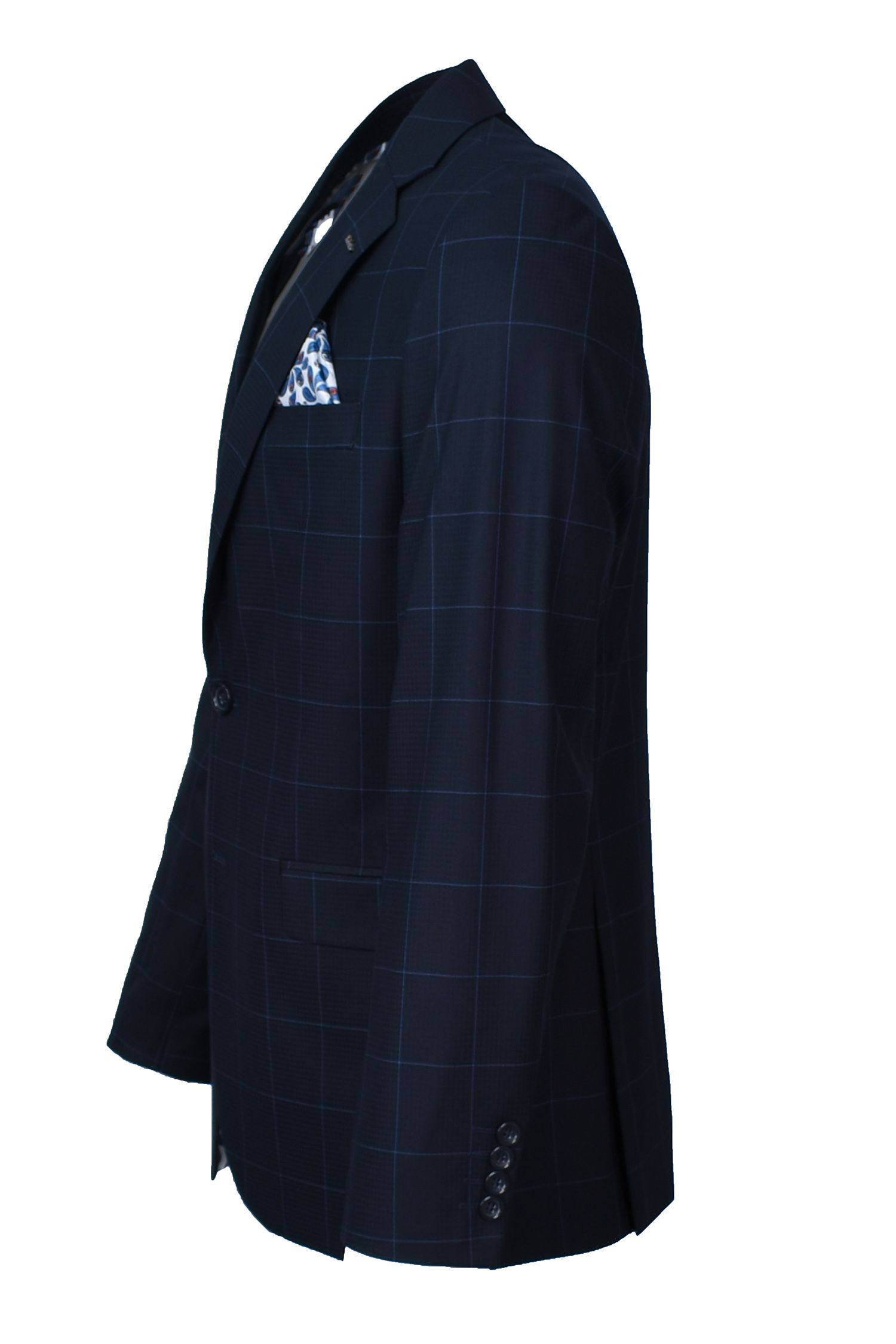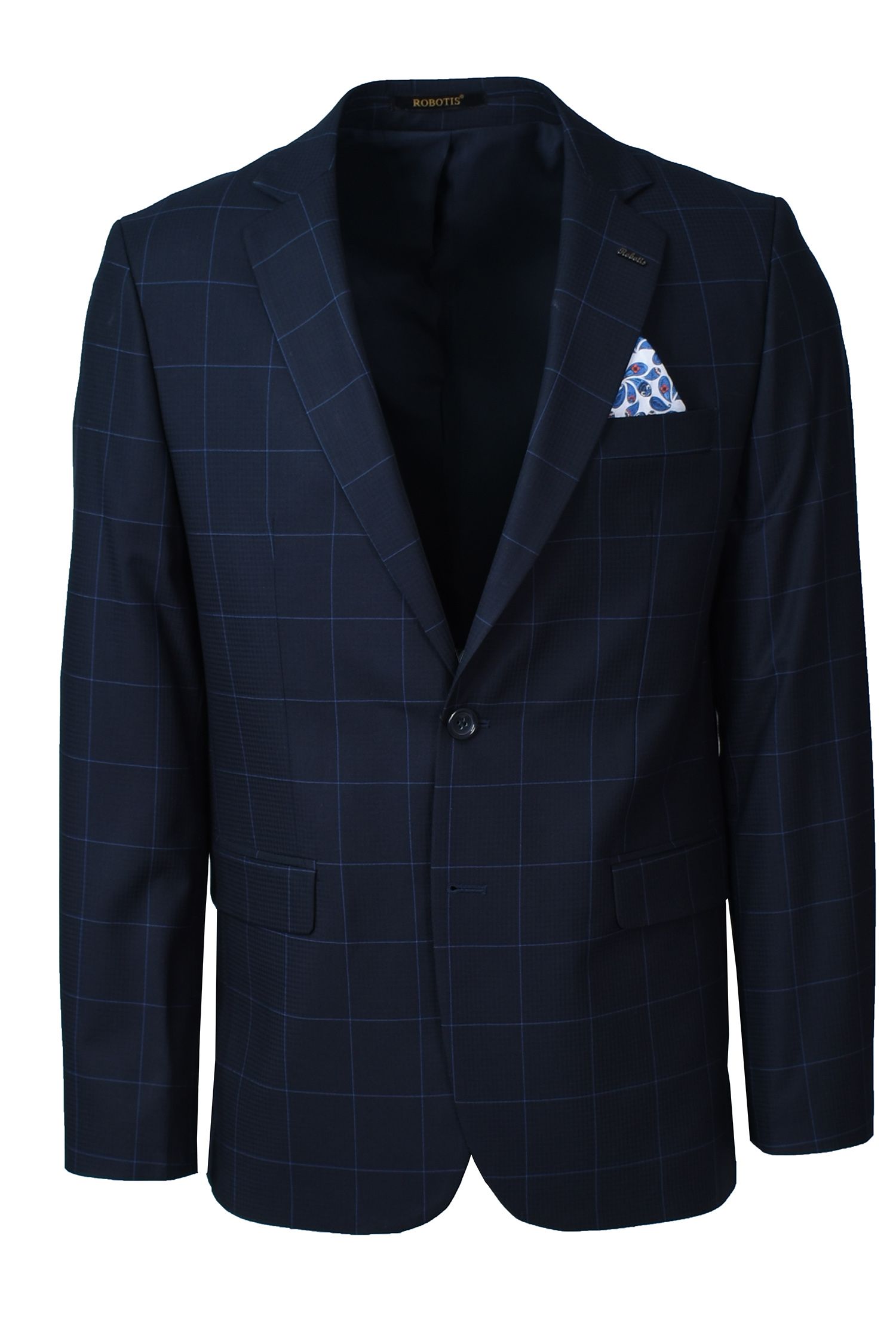 Κοστούμι σε στενή γραμμή σε ύφασμα λείο με σχέδιο καρώ μπλέ.Σχέδιο ραφής δυο κουμπιά μπροστά και δύο ανοίγματα πίσω.Εσωτερικά έχει σχεδιαστή φόδρα με ενσωματωμένο μαντήλι.Το παντελόνι είναι σε στενή γραμμή με δύο τσέπες λοξές μπροστά και δύο πίσω.Διατιθεται γύλεκο απο το ίδιο ύφασμα.