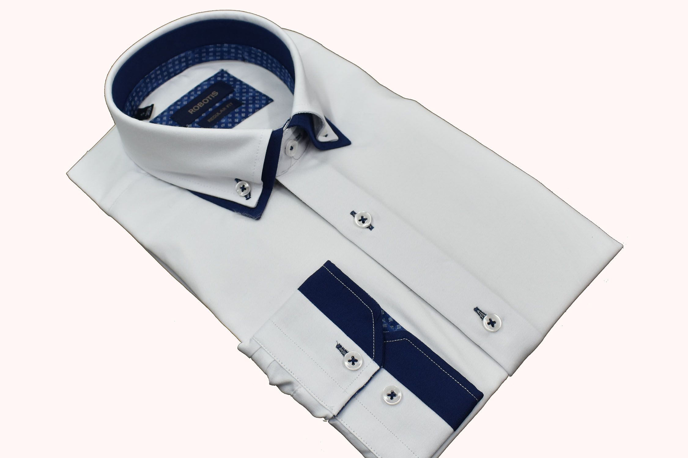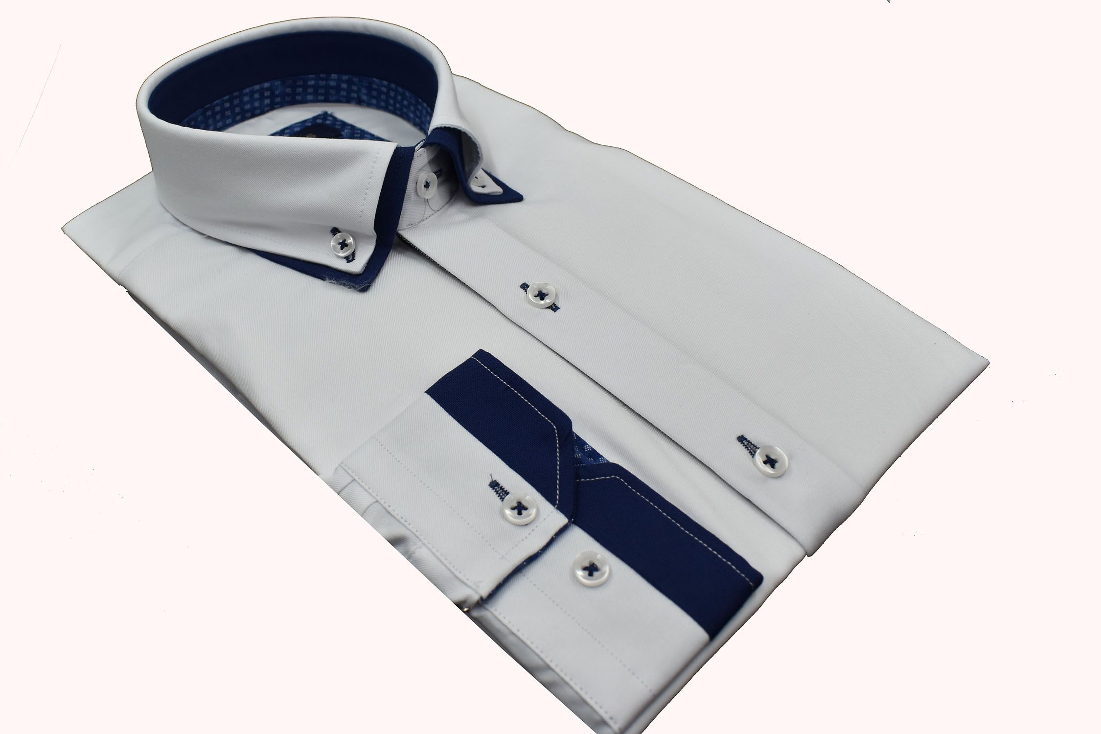 Υποκάμισο βαμβακερό σε λείο ύφασμα.Είναι ραμμένο σε κανονική γραμμή.Ο γιακάς είναι με κουμπί και φιλέτο μπλε στο τελείωμα του σε συνδιασμό με τη μανσέτα.