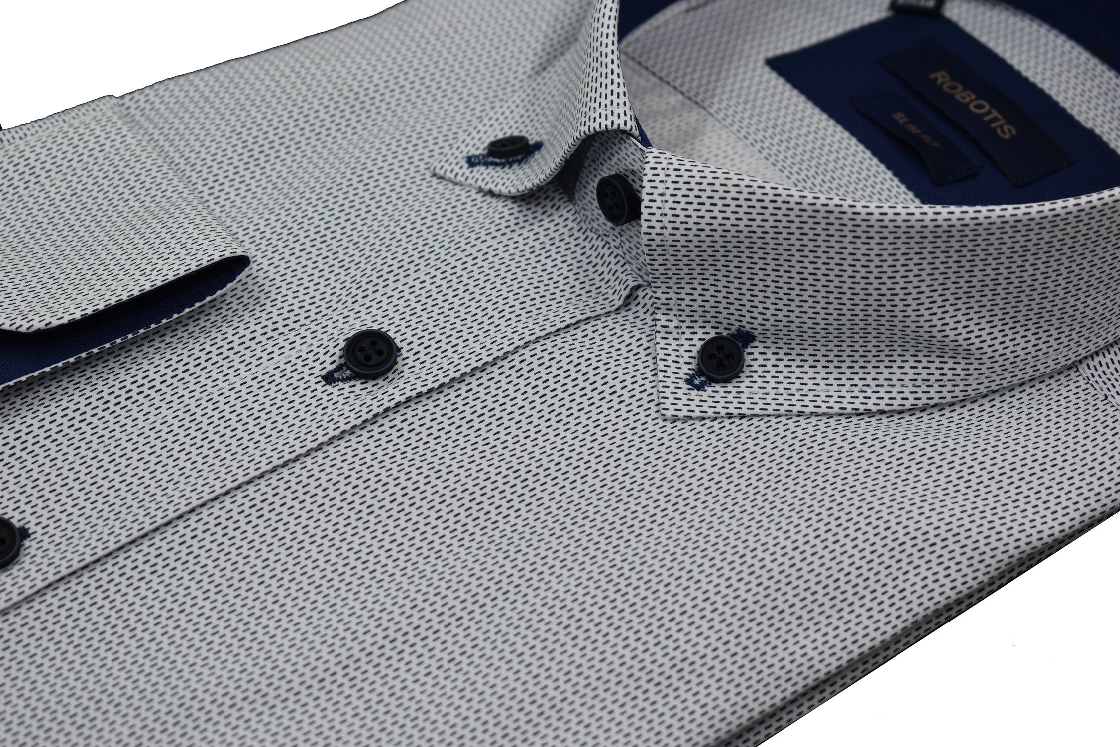 Πουκάμισο βαμβακερό ραμμένο σε στενή γραμμή με μικροσχέδιο στο ύφασμα.Κοντό γιακά με κουμπάκι και εσωτερικά μπλέ ύφασμα βαμβακερό.Στο στήθος είναι κεντήμενο το λογότυπο της εταιρείας.Πουκάμισο που μπορεί να συνδιαστεί με πολλές αποχρώσεις.