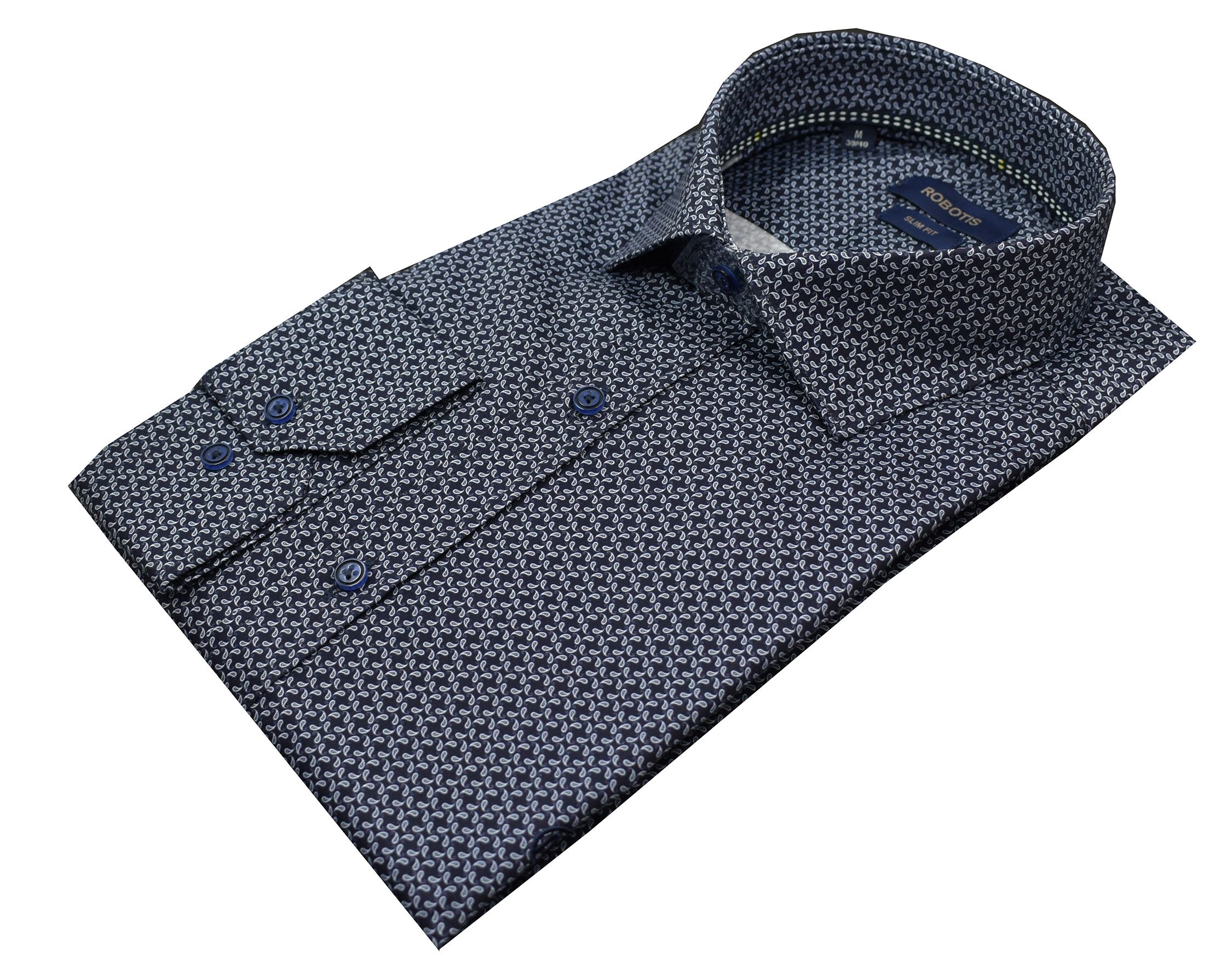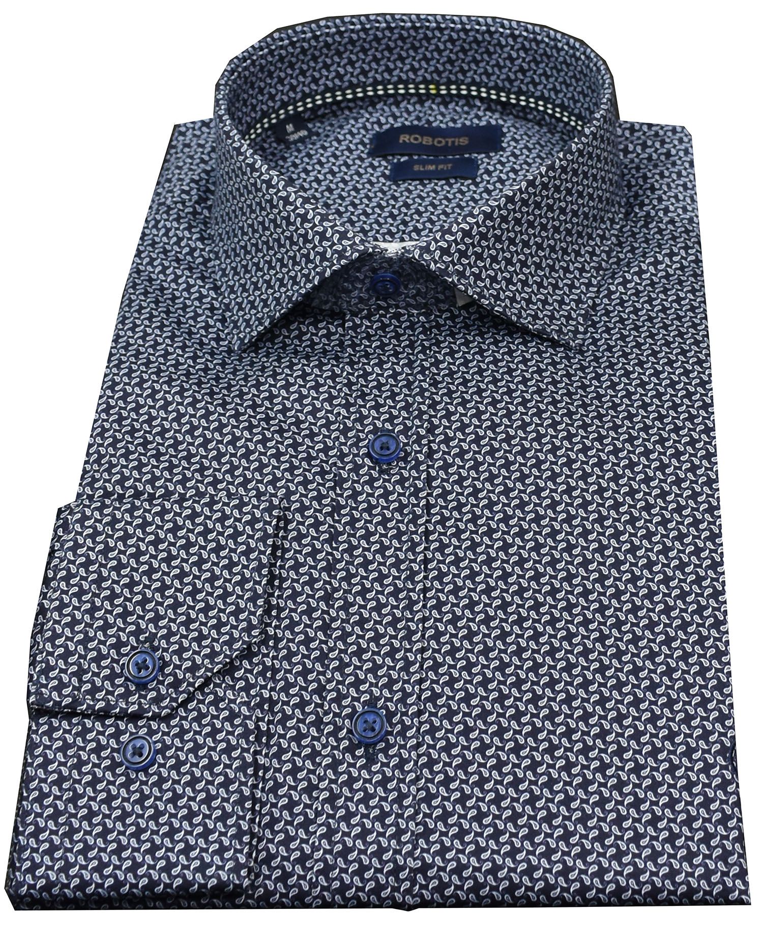 Πουκάμισο βαμβακερό σε στενή γραμμή με σχέδιο λαχούρι στο ύφασμα.Σε απόχρωση σκούρο μπλέ ιδανικό για κάθε συνδιασμό.Ο γιακάς του είναι rex σκληρός με μπανέλες εσωτερικά για καλύτερη συγκράτηση του γιακά.Τοποθετημένο μοντέρνο σκούρο μπλέ κουμπί.Κεντημένο διακριτικό σήμα στο ύψος του στήθους σε απόχρωση μπλέ.Ιδανικό πουκάμισο να φορεθεί με σακάκι και γραβάτα για ολη τη μέρα.Συμβουλευτείτε τον οδηγό μεγεθών.