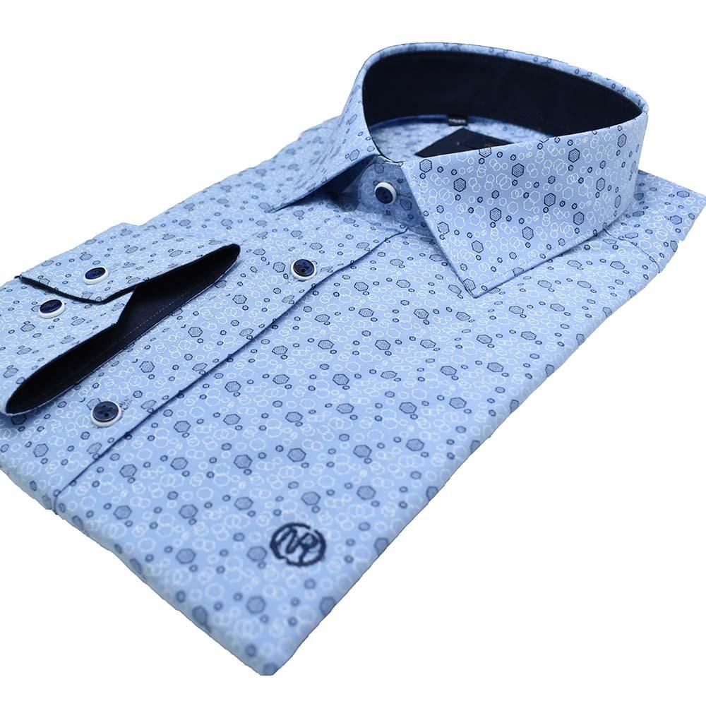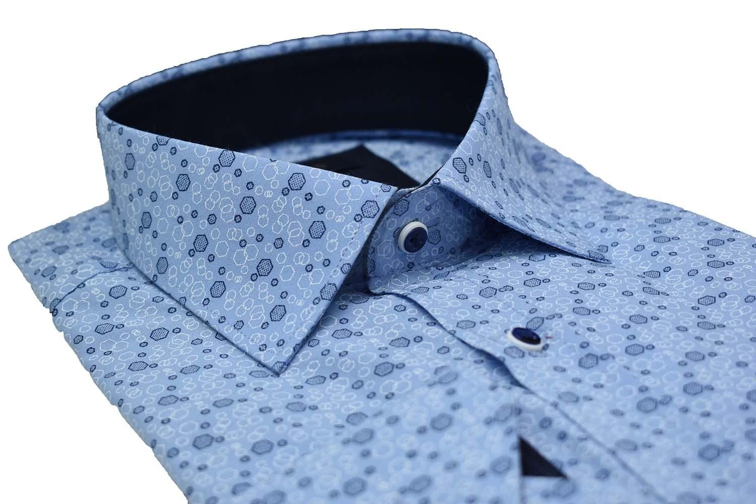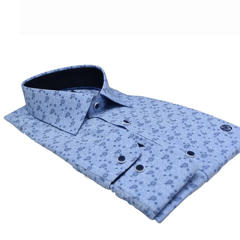 Υποκάμισο μακρυμάνικο βαμβακερό χωρίς τσέπη με σχέδιο στο ύφασμα, σε στενή γραμμή (slim fit) με κοντό γιακά και κοντή μανσέτα.Περιμετρικά στο γιακά έχει ύφασμα σκούρο μπλέ όπως και στη μανσέτα. Διακριτικό κεντημένο σηματάκι της εταιρείας στο ύψος του στήθους.Συμβουλευτείτε οδηγό μεγεθών.