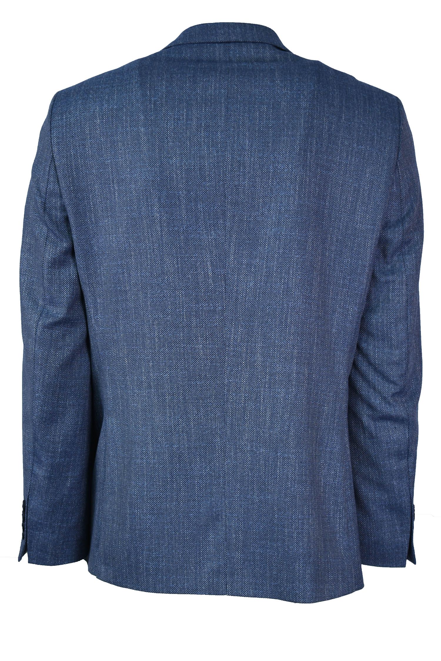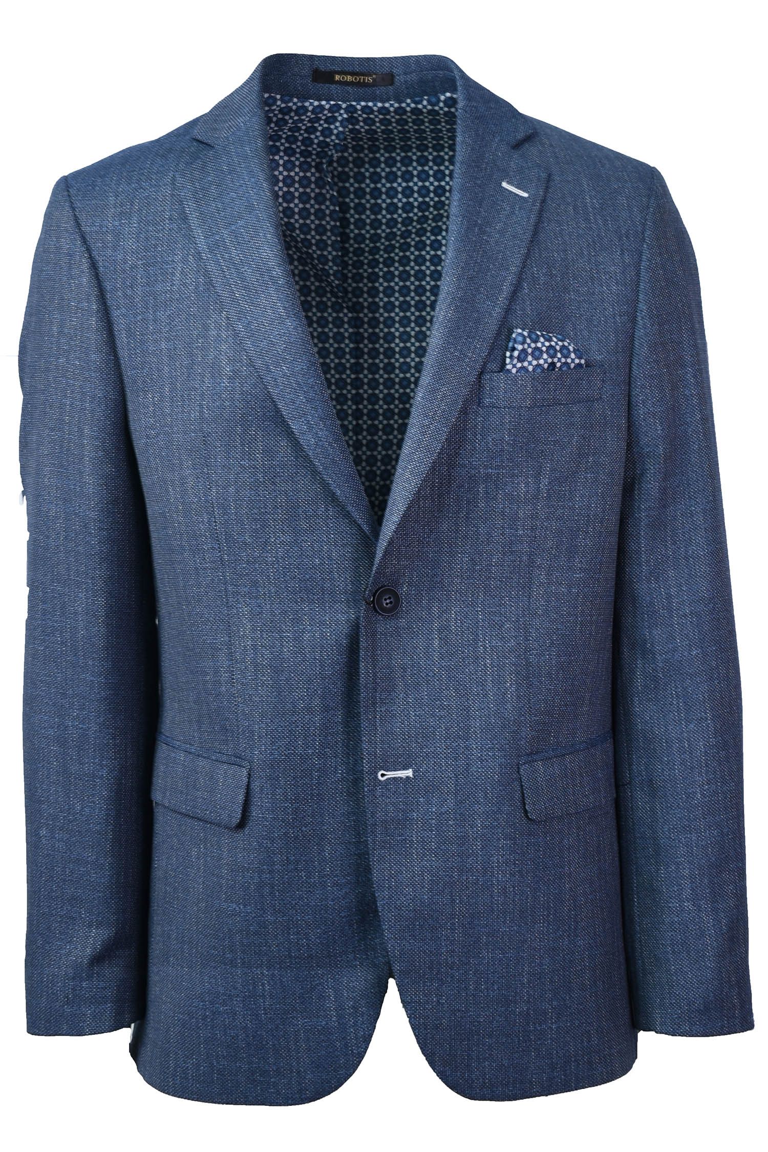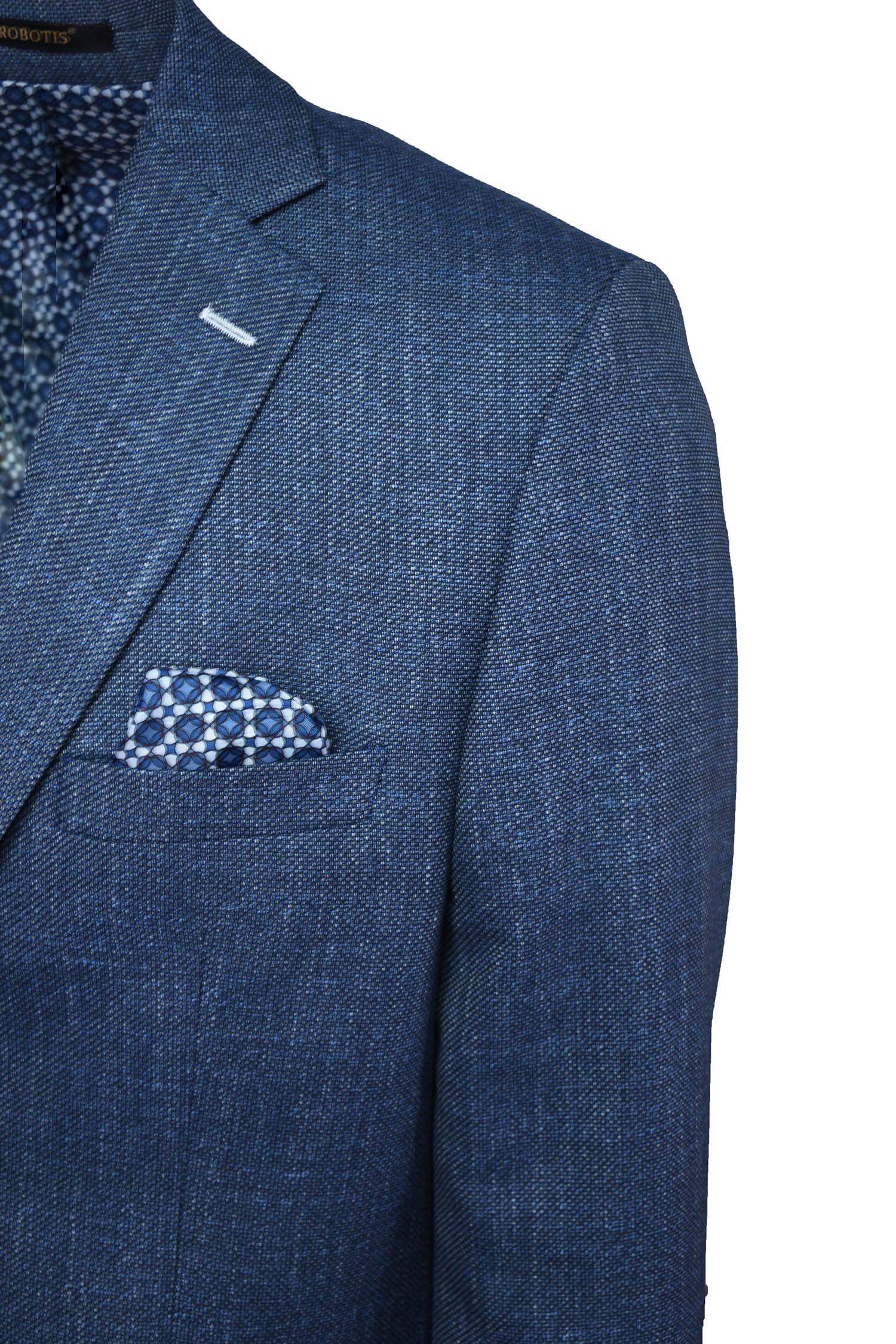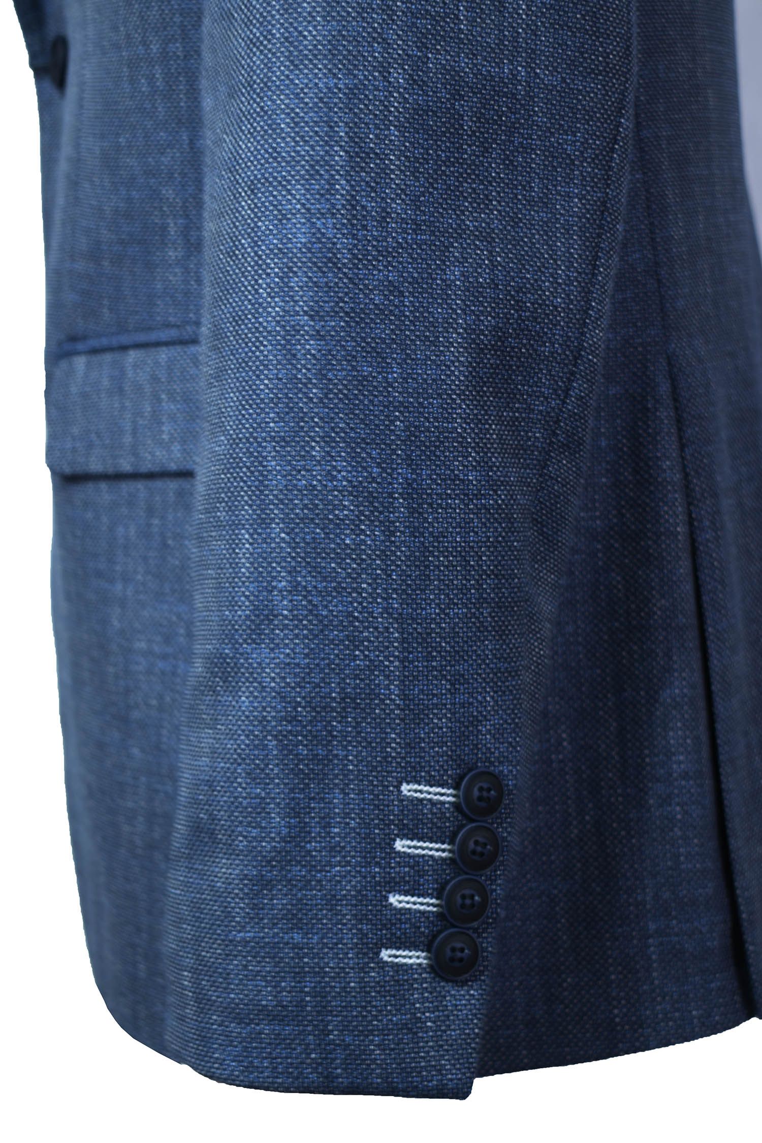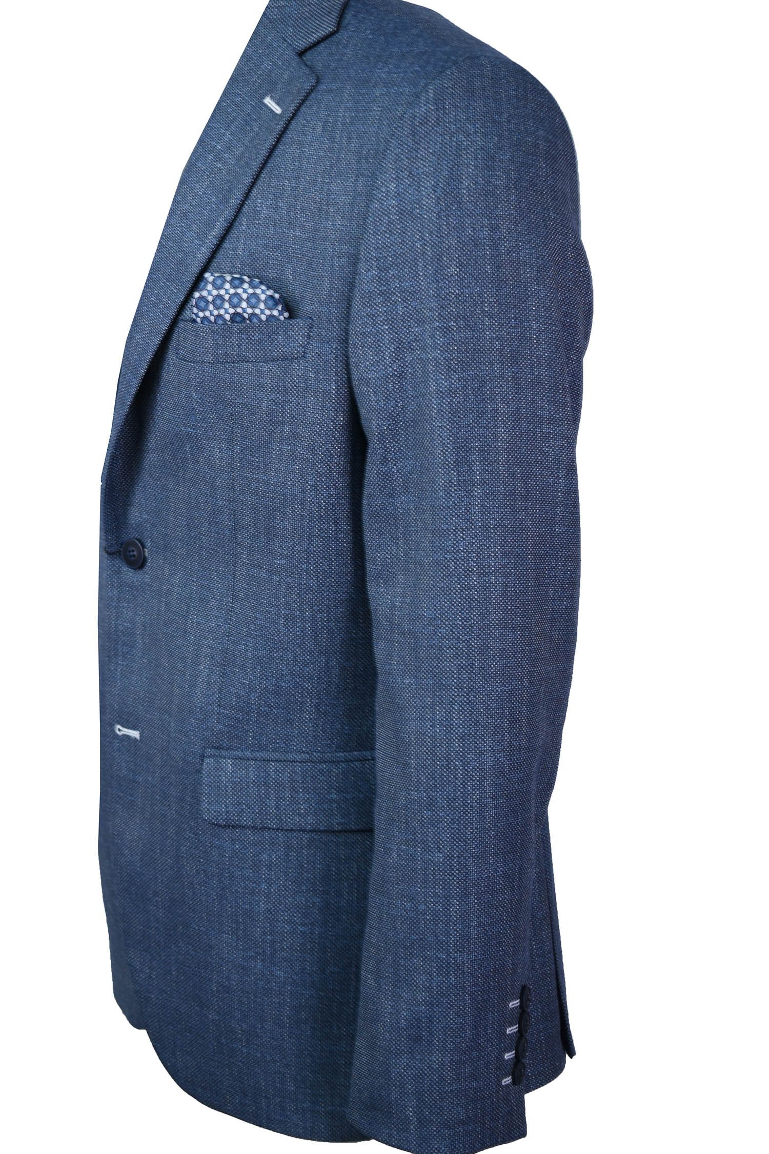 Σακάκι σε ύφασμα λινό με βαμβάκι σε κανονική γραμμή.Απόχρωση μπλέ ανοικτό με λεπτομέρειες λευκές στην ύφανση.Ανετο και δροσερό ύφασμα και εφαρμογή.Έχει δυο κουμπιά μπροστά και δυο ανοίγματα πίσω για άνεση στη κίνηση.Εσωτερικά σχεδιαστή φόδρα με δυο τσέπες εκ των οποίων η μια ασφαλίζει με κουμπί.Εξωτερικά τσέπη στο ύψος του στήθους με εσωτερικό ενσωματομένο μαντήλι.Δυο τσέπες μπροστά, μοντέρνο κουμπί με λευκή κουμπότρυπα.Ενα ρουχο σχεδιασμένο να καλύψει κάθε ανάγκη μέσα στη μέρα.
